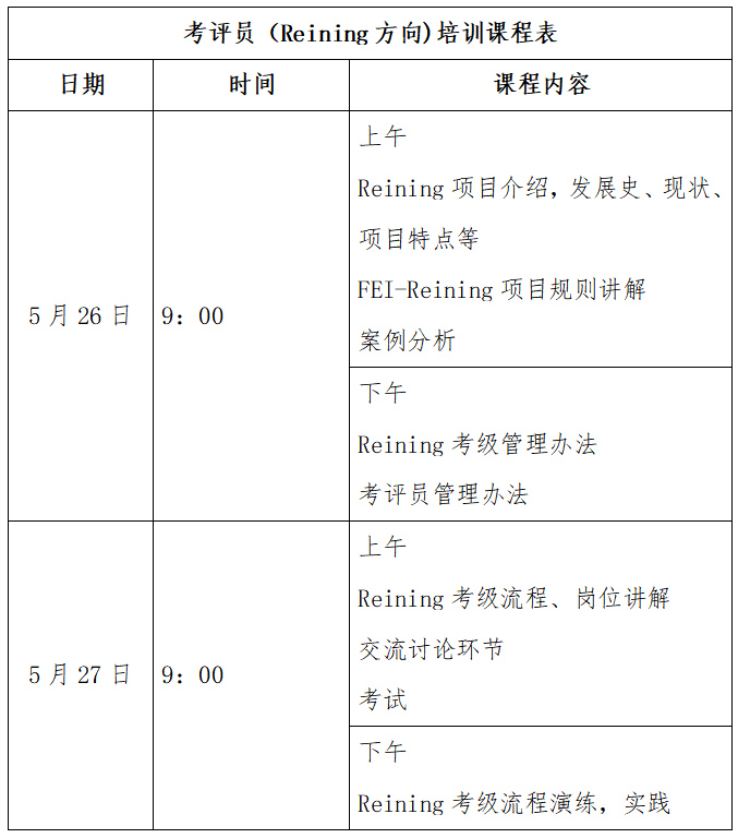 根据考评员(Reining方向)工作整体安排,我协会将于2021年5月26日-28日在北京市无疆牧场国际马术俱乐部举办考评员培训活动,合格者授予相应等级考评员证书。现就本次培训考核相关事宜通知如下: