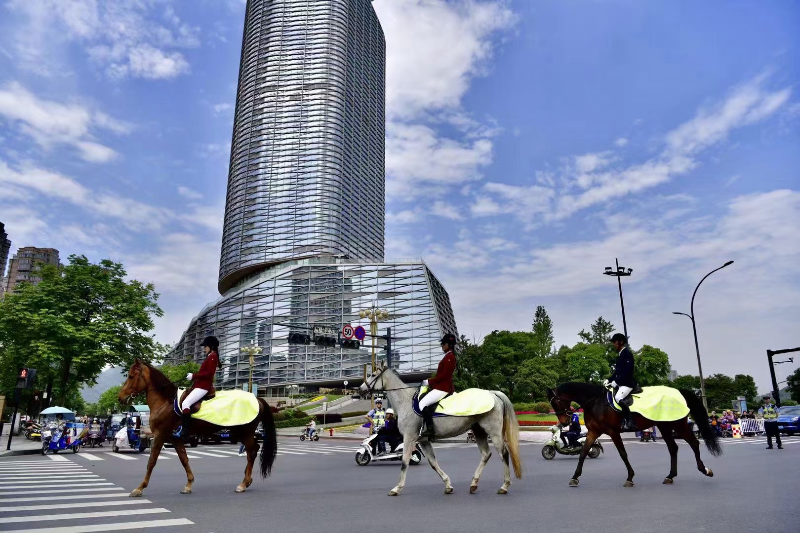 5月6日,在第十届桐庐百姓日上,亚运马术表演来到市民身边,和大家零距离互动,成为今年百姓日的一大亮点。上午9点,8匹俊马昂首挺胸,步调统一,呈“一”字形缓缓出现在人们的视野,立即引起一阵欢呼。骑手们英姿勃发,头戴黑色礼仪帽,脚蹬闪亮马靴,端坐在骏马上,大家说,电影里这场景是不少见,但在桐庐还是头一回。