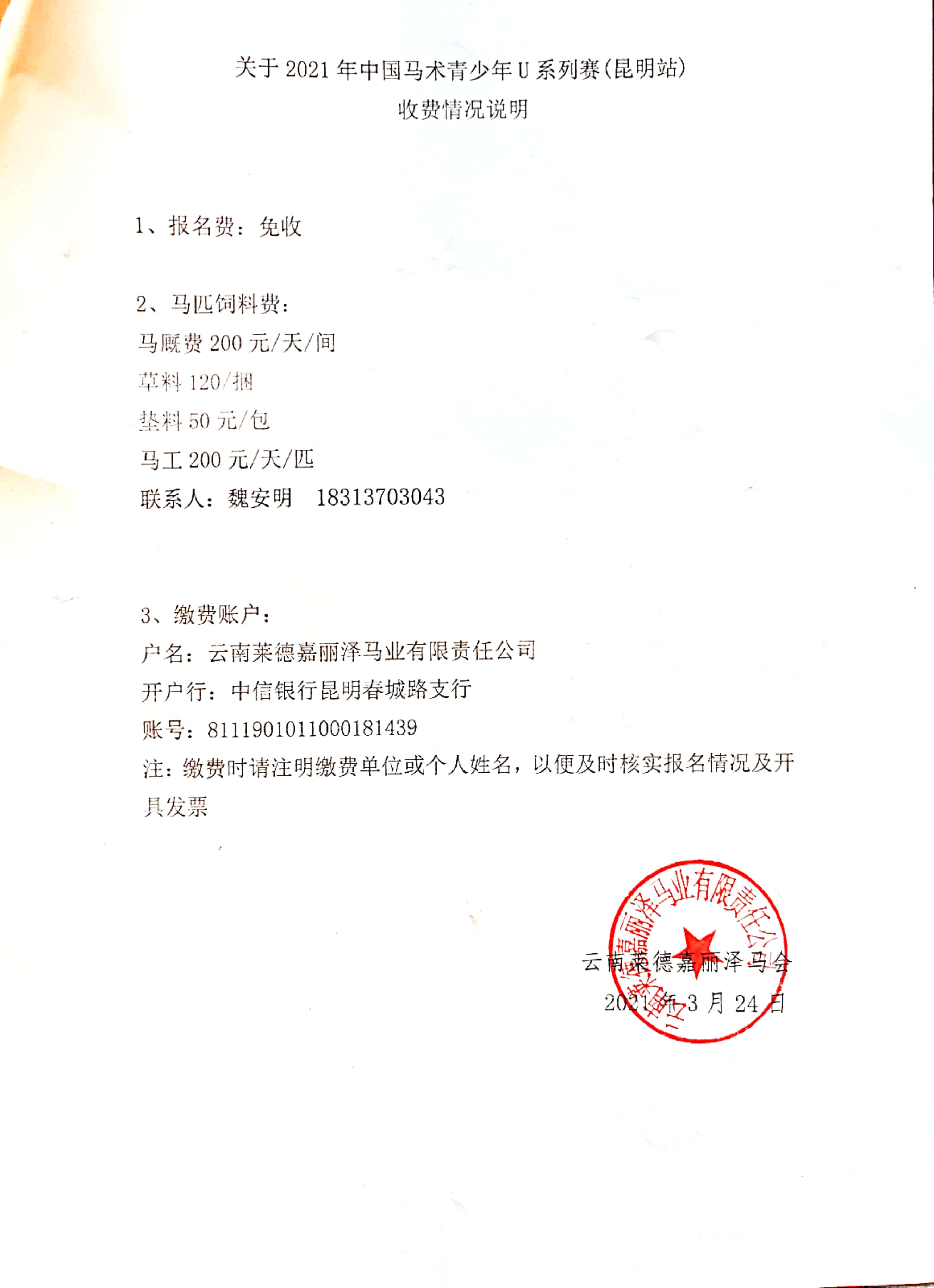 本次比赛报名请填写《2021年中国马术青少年U系列赛(昆明)报名表》,并将加盖公章的报名表电子版发送至邮箱: