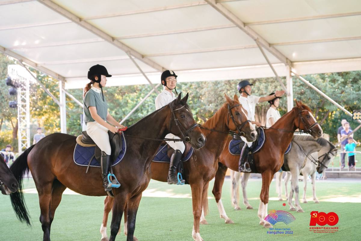现场,亚运赛事直播信号测试成功,亚洲马术联合会授予桐庐亚运马术纪念牌,还有马术表演队盛装舞步表演、300余人上演《等你来》亚运舞曲、亚运知识互动有奖竞猜、亚运特许商品展销义卖……吸引了不少市民和游客参与、体验。