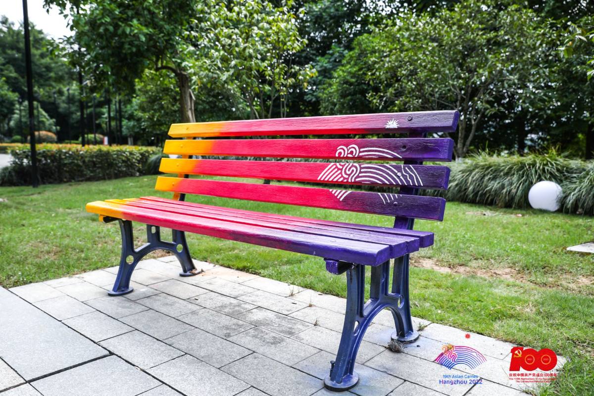 在马术主题馆外的亚运主题街区,以亚运马术为主题的公共艺术作品,如同繁星点缀在富春江沿岸,彰显着桐庐“绿色、智能、节俭、文明”的办会理念。围栏、长椅等公共物品披上了亚运的绚丽色彩,亚运倒计时装置提示着亚运脚步渐近,灯光景观提升后,夜幕下也能感受到浓厚的亚运氛围。