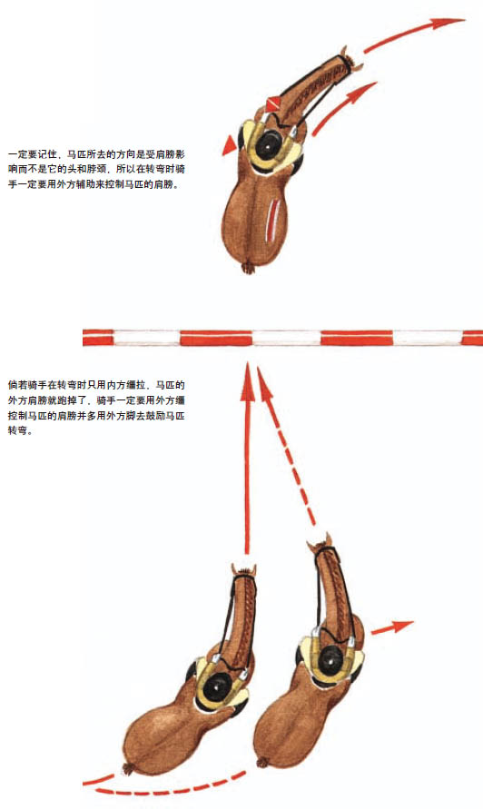 所有造成转弯困难的原因,都是由于马匹没有平衡,以及后肢用力不够,如果马匹没有把重量放在后肢上,你就会有在驾驶一辆爆了前胎的汽车一样的感觉。跳障碍落地后出现的转弯问题可能是由于马匹冲障碍, 如果马匹跳障碍时跳得太快或太平,它落地时就会失去平衡的姿态。如果马匹想达到好的平衡,马匹一定要建立正确的平地工作,每天都应进行转弯、转圈这些练习,骑手一定要想着用正确的外方辅助。