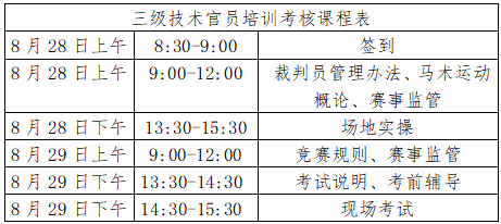 根据现阶段防疫政策及相关文件精神,原定于2021年5月29日-30日在深圳维多丽亚国际马术俱乐部举办三级技术官员培训考核活动,现定于在2021年8月28日-29日举办,合格者授予中国马术协会相应等级技术官员证。本次培训考核相关事宜通知如下: