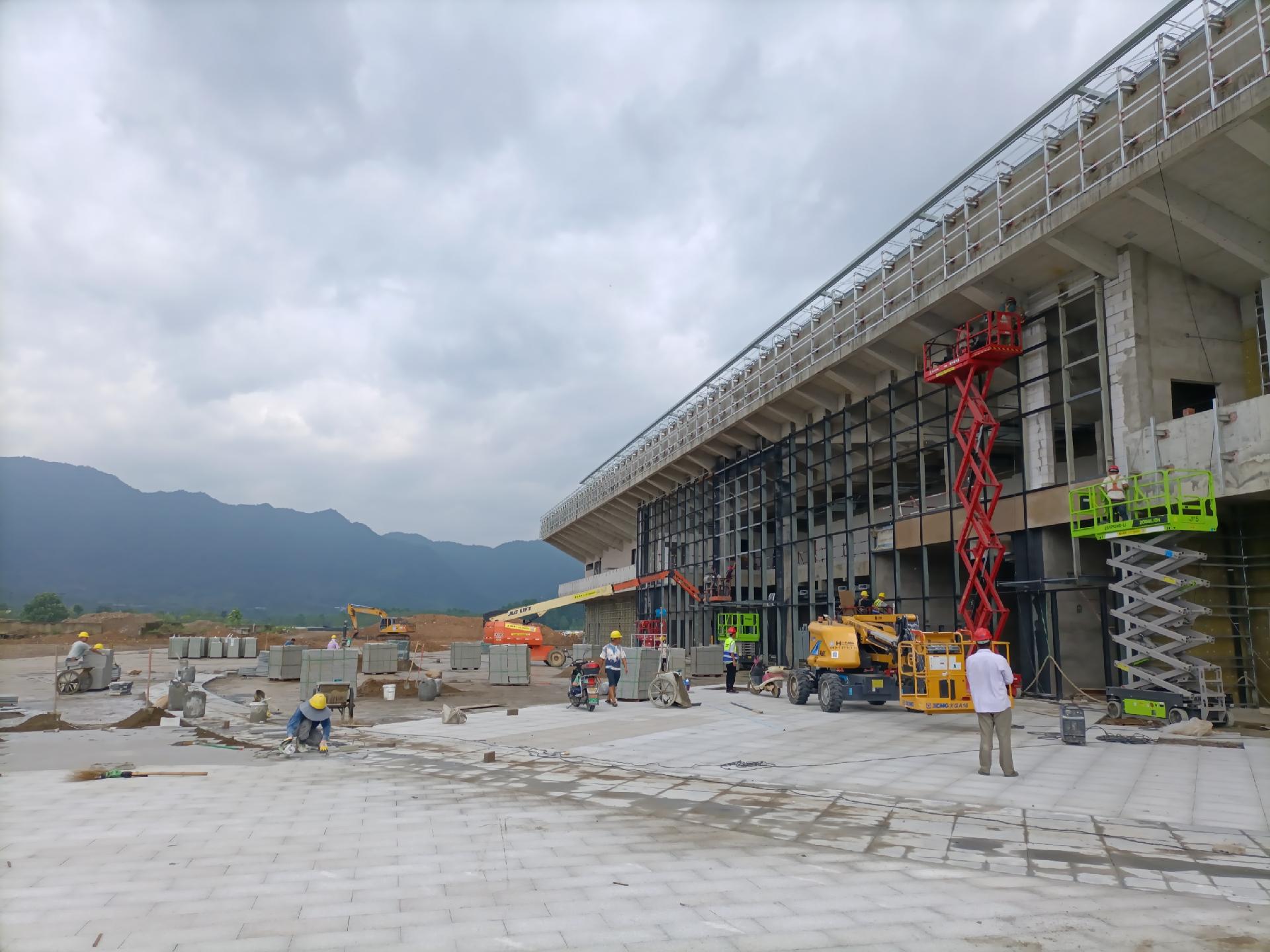 “主场馆所有外架已基本拆除,整体形象已初显。”项目经理杜挺康介绍,现在已进入施工收尾阶段,工人们正进行室内精装修及室外市政作业。值得一提的是,在开工不到一年时间里,已完成总工程量的近90%,计划于9月底前全面竣工,年底前启动场馆试运行。