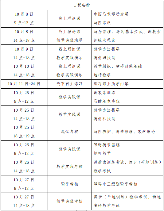 (三)线下辅导和实践考核:2021年10月25日-10月27日,在秦汉新城全运会马术赛场(暂定)进行线下集中辅导与实践考核。