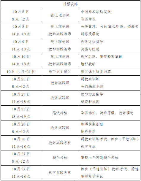 (三)线下辅导和实践考核:2021年10月25日-10月27日,在秦汉新城全运会马术赛场(暂定)进行线下集中辅导与实践考核。