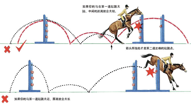 一个粗略的准则,一道中间马匹跑一步的双重障碍,应该徒步丈量8步。一道中间马匹跑两步的双重障碍,应该徒步丈量11步。在实践丈量类似障碍中,要想知道障碍之间距离长了还是短了,必须清楚8步或11步的“感觉”。