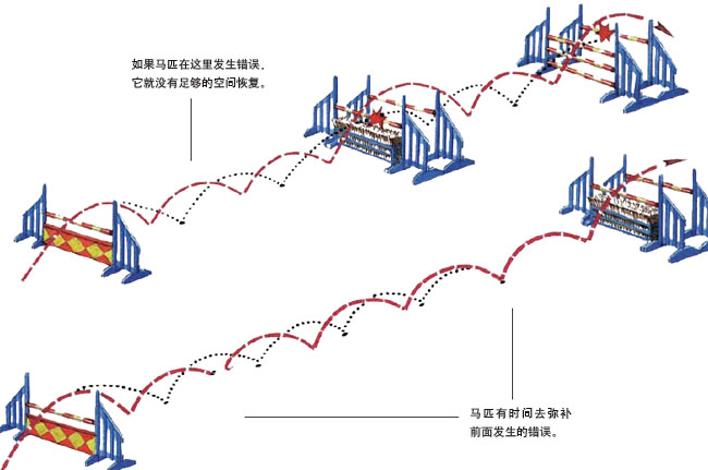 去看其他马匹跳关系障碍也是很有用的,有助于你去思考如何跳。但是要小心,不要误解,别的马匹不一定与你的马匹相同。在关系障碍中,如果你的马匹在第一道障碍出现错误,这个关系障碍就不会跳得很好。它落地有可能太远或太近,那么也会让后面障碍的距离太近或太远。