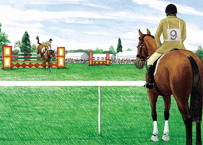 最初几次比赛应是小级别的障碍,让它不会受到惊吓。当你进入场地障碍后,先围绕场地转一圈,但不要故意去做给它看。让马匹在关系障碍之间快步,或者从那些具有夸张填充物的障碍前经过,然后再开始你的比赛。请记住,你在教你的马匹,必须让它学会,而且要尽最大的可能保持很好的节奏。