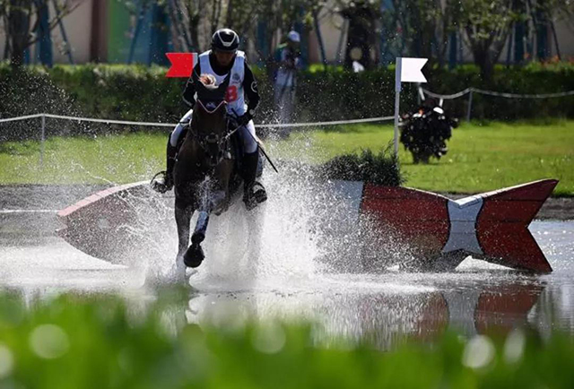 西藏队骑手边巴次仁与战马“乌诺”三项赛-越野赛项目中 ©新华社