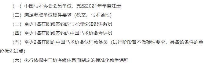 近日,中国马术协会发布中马协字〔2021〕218号《中马协关于公开招选基础级考核试点单位的通知》,试点推进基础级考核工作,公开招选中马协基础级考核试点单位。其中资质要求第五条阐明需要至少2名在职的中国马术协会认证教练员,具备该条件的单位将优先作为试点。此次基础级考核试点单位招选,将探索中马协考级体系与俱乐部教学融合发展,促进俱乐部基础教学体系化与规范化。同时资质要求与中国马术协会认证教练员挂钩,对于俱乐部和学员,拥有中马协认证的教练员身份愈发重要且必要。