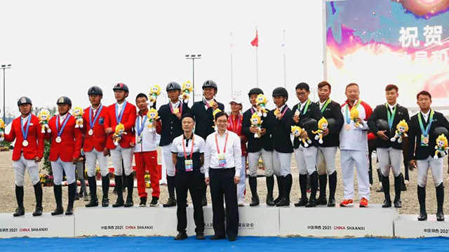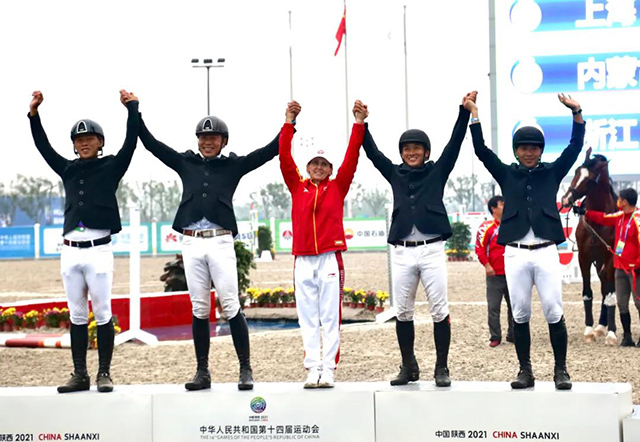 北京时间9月23日18:00,第十四届全运会马术项目场地障碍团体赛(个人资格赛)在西咸新区秦汉新城马术比赛场地落下帷幕。经过两轮比赛的角逐,由张滨、杨华、沈沉达、许新组成的上海队以16分的总罚分夺得第十四届全运会场地障碍赛团体冠军,由韩丰、张睿、刘同晏、达日玛组成的内蒙古队以20分的总罚分锁定了亚军荣誉,由张兴嘉、陈贺其勒图、段义华、徐昊组成的浙江队以23分的总罚分将团体铜牌收入囊中。获得第四位至第六位的分别是广西队、广东队和北京队。