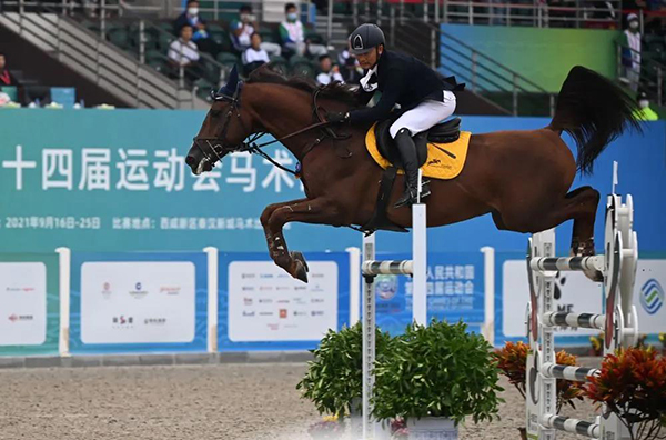 图为李振强代表广东马术队参加全运会马术场地障碍团体赛。新华社记者 郭程 摄