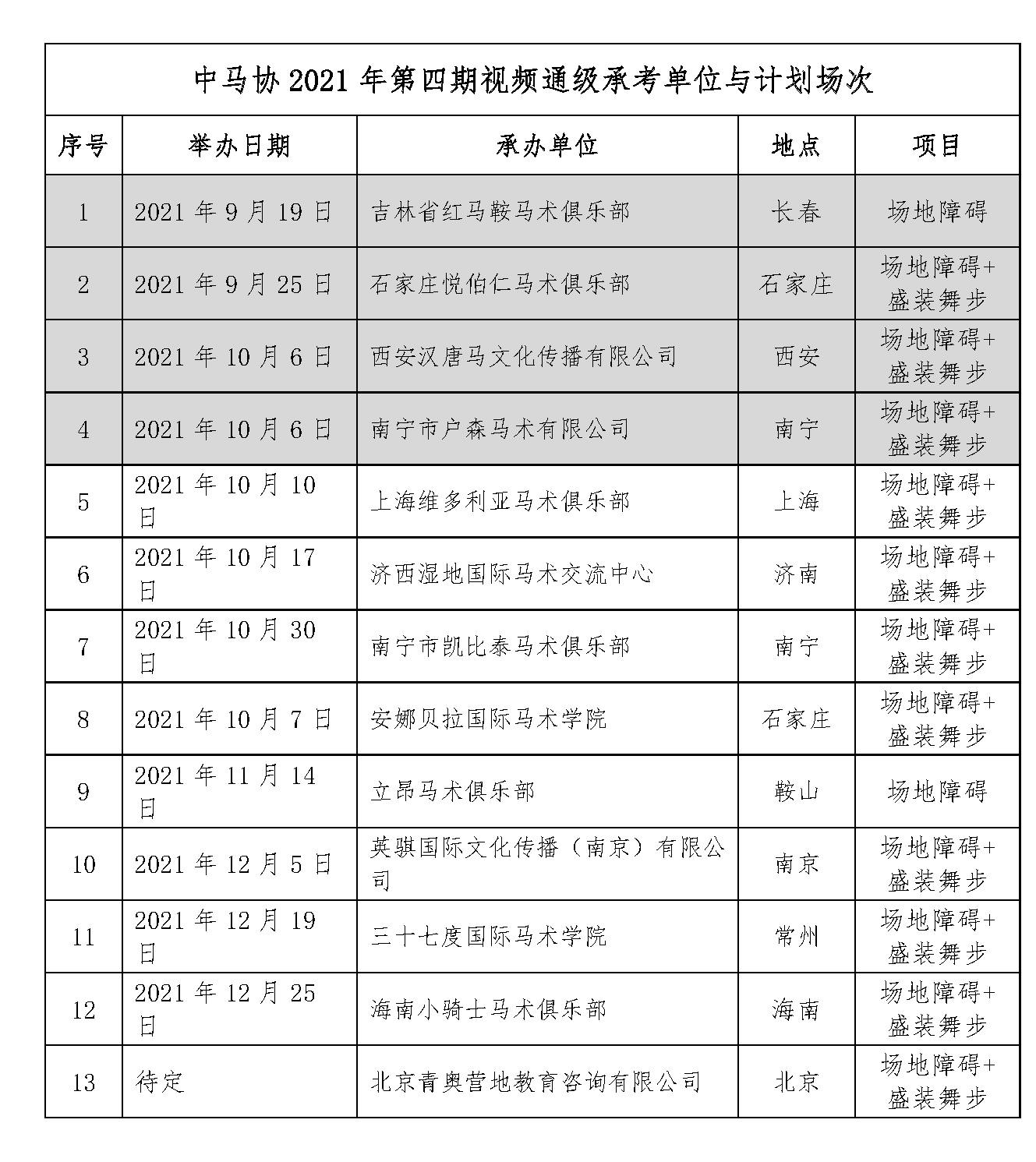 (五)在本期所有承考单位考核视频拍摄上报完成后,中国马术协会组织考官在京评审打分,通过考核的等级名单将在官网公示。
