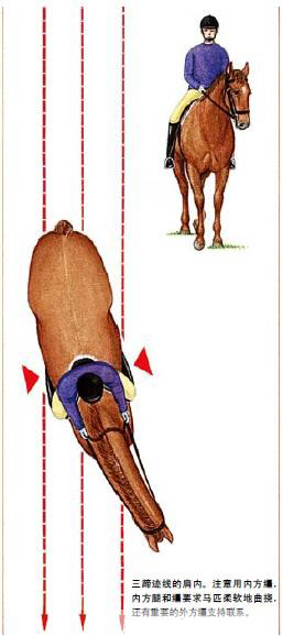 骑手开始做肩内时,用内方缰轻微地要求马匹,让马保持柔软的曲挠,外方缰要求马的肩离开蹄迹线。内方腿在肚带处,保持马匹向前的动力,让马匹继续前进,走蹄迹线。外方腿控制纠正错误。三蹄迹线的肩内。注意用内方缰,内方腿和缰要求马匹柔软地曲挠,还有重要的外方缰支持联系。