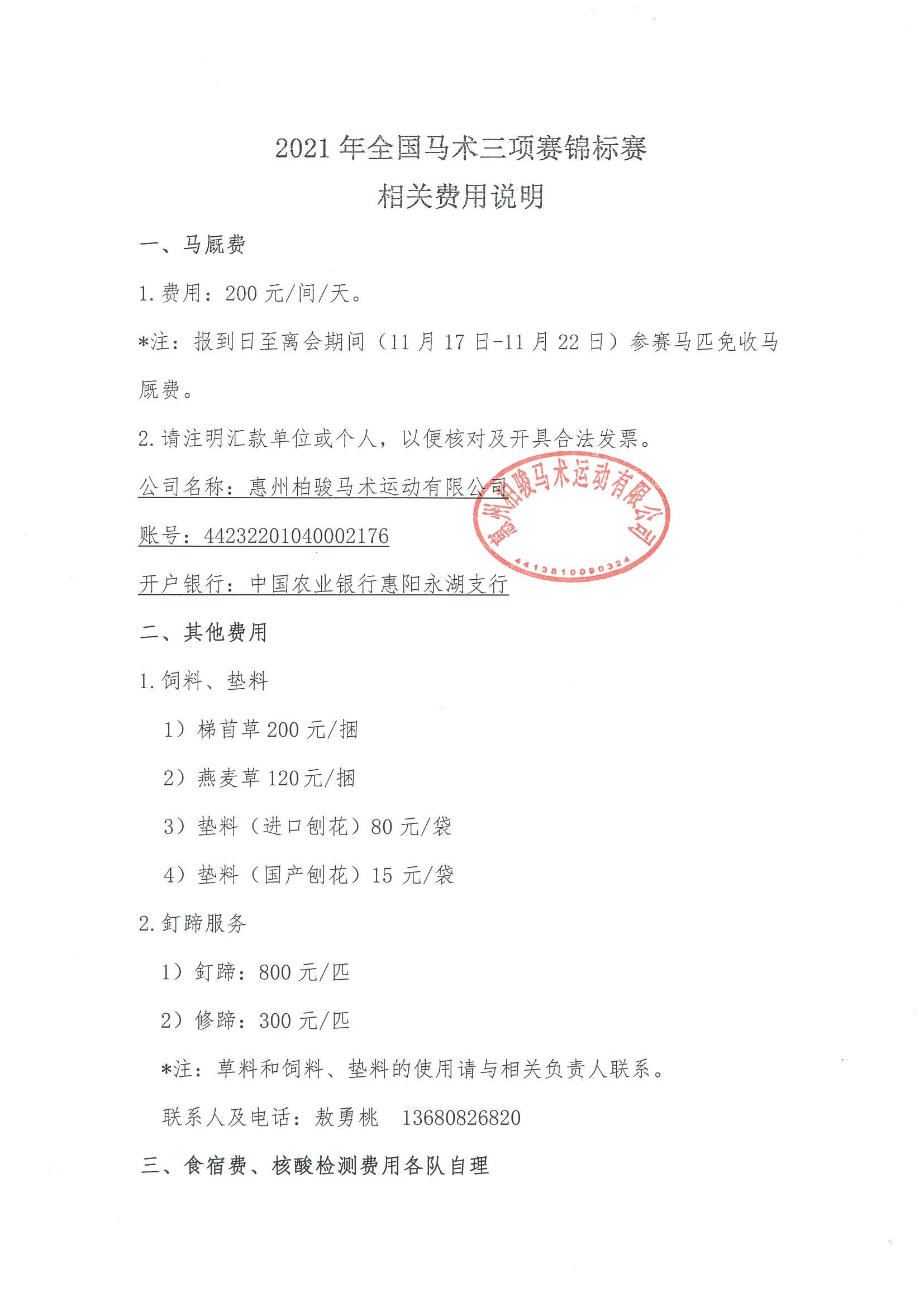 2021年全国马术三项赛锦标赛将于2021年11月19日(周五)至21日(周日)在广东省惠州市柏骏骑术会举办。为使比赛顺利进行,现将赛事有关事宜通知如下: